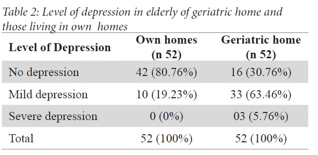 Introduction: Elderly people suffer from many acute and chronic illnesses and also show higher prevalence of depression. The trend of old age homes is rising in Nepal. The aim of this study was to assess depression in the residents of a geriatric home and compare it to that in the elderly population living in their own homes. Methods: This was an observational cross-sectional study in which residents of a geriatric home above 60 years of age were selected as cases, and those living in their own homes were selected from the local community as a comparison group. Depression was measured with Geriatric Depression Scale (GDS) comprising 30 questions. Chi-square (or Fisher Exact) test was used to compare categorical variables. Results: There were 52 participants in both groups. Thirty-six (69.2%) participants from the study group had depression whereas only 10 (19.2%) from the comparison group had depression. This difference was statistically significant, the odds ratio being 9.45. Conclusion: Depression is significantly high in elderly population living in a geriatric home as compared to those living in their own homes.