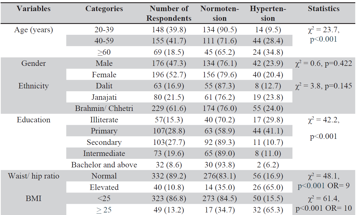 Introduction: Hypertension mostly remains asymptomatic when controlled, however, there is always an increased risk of heart disease, stroke, and renal failure. The higher the blood pressure, the higher the likelihood of harmful consequences to the heart, blood vessels, eyes, brain, and kidneys. Methods: A community-based cross-sectional study was conducted in the adult population. The blood pressure was measured from the left arm, the respondents in sitting posture and arm support at the heart level. Results: The prevalence of hypertension was 22% and higher in people above 60 years of age. The prevalence of hypertension was more in people who had elevated waist to hip ratio (65%) and positive family history (40.8%). The prevalence of hypertension was observed high among diabetics (63.2%) and in smokers (33.3%). Conclusion: The prevalence of hypertension was seen positively associated with increasing age, smoking, alcohol sedentary lifestyle, diabetes, stress, central obesity and >25 BMI.