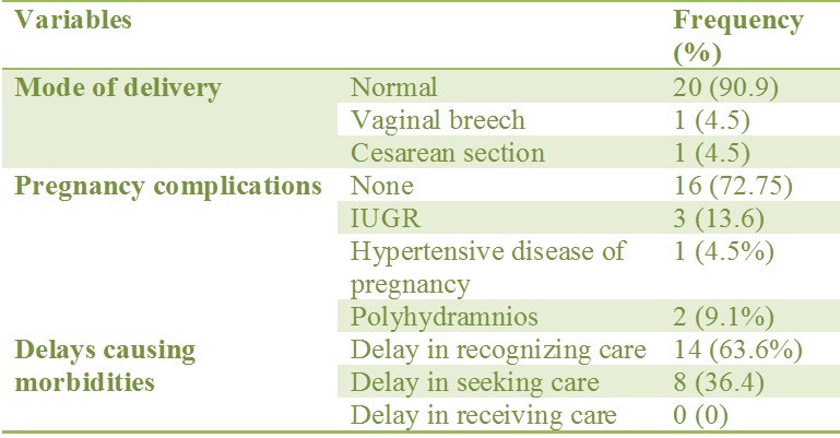 Introduction: Neonatal congenital anomalies are the 17th leading cause of global disease burden. Congenital anomalies in low-income countries are high due to prevalence of nutritional deficiencies, intrauterine infections, teratogenic exposure and unsupervised self medication. This study aimed to find various antenatal risk factors for birth defects and the delays in health seeking behaviors in cases of still births with birth defects. Methods: In this retrospective study the records of mothers and neonates born with congenital anomalies during the period of 30 months were reviewed. Consanguinity, intrauterine infections, presence of anemia, and history of drug intake were noted. In cases of stillborns with anomalies, mode of delivery, labor complications and the three delays leading to morbidities were also noted. Results: There were 65 congenital anomalies during the study period with an incidence of 9.3 per 1000 births. Out of them, 43 were live births and 22 were still births. The commonest anomaly amongst live births was of musculoskeletal system (n=11, 25.5%) and amongst still births was of nervous system (n=10, 45.4%). Consanguineous marriage was present in 30 (46.1%) parents and folic acid was taken by only 26(40%) of the mothers. In cases of still births with anomalies, most deliveries were vaginal (97%) without any maternal complications. Among the three delays, delay in deciding to seek care was observed in most cases (n=14, 63.6%).Conclusion: Factors like consanguinity and intake of folic acid are modifiable factors useful in preventing congenital anomalies. Encouraging early antenatal visits might help in early detection of anomalies.
